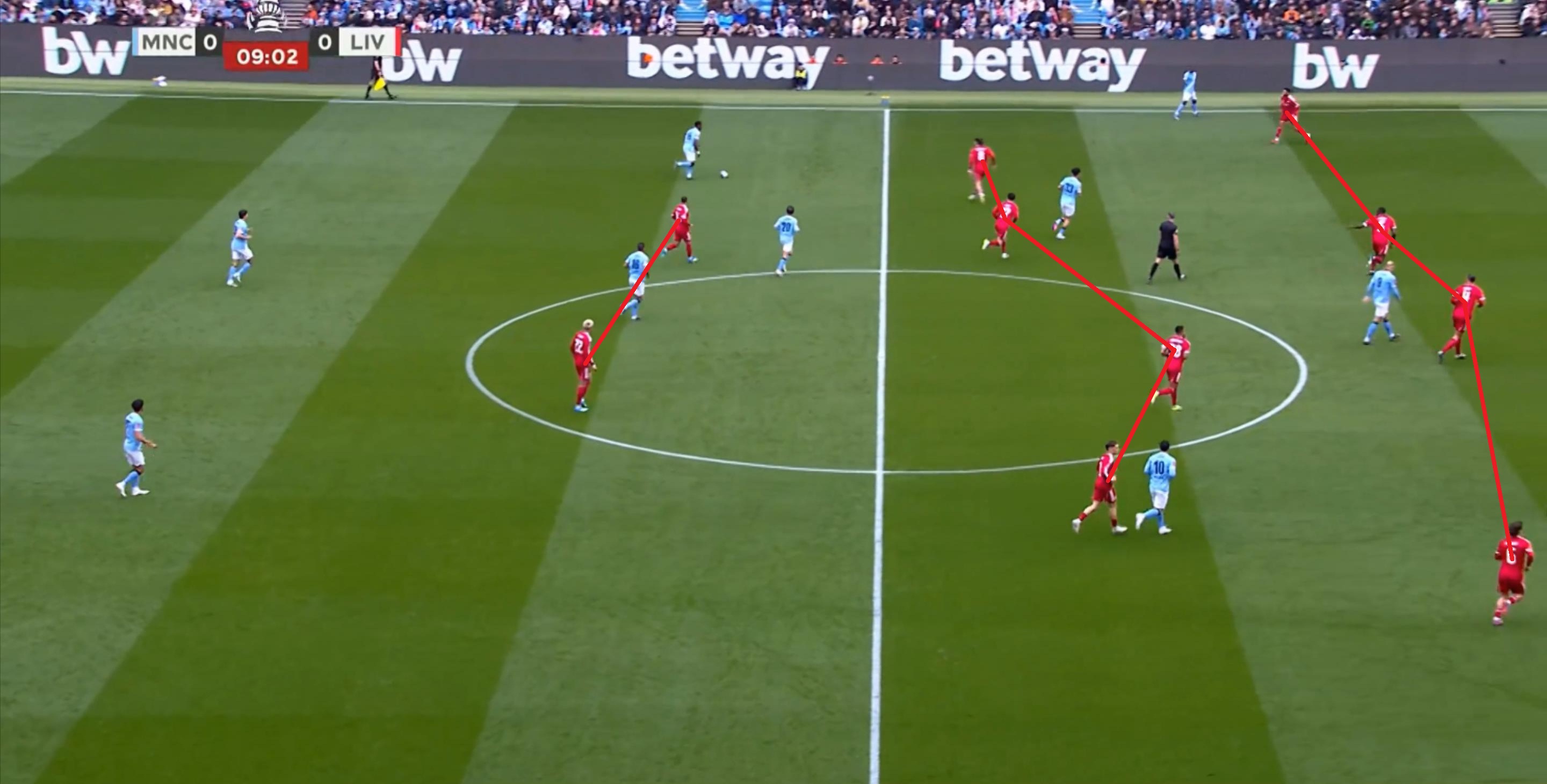 所以在进攻的时候,利物浦的双前锋会拉得非常开,几乎会呈现出各自负责一个半扇的思路,以此来吸引曼城的防守注意力,从而为中路和远端制造空间。