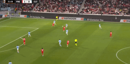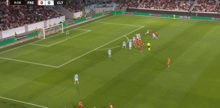第32分钟,马塔诺维奇横传,贝斯特一蹴而就,弗赖堡1-0塞尔塔