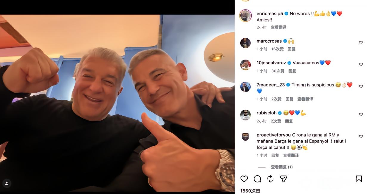 皇马主场1比1战平赫罗纳后,拉波尔塔和助手马西普晒出庆祝合影,相关画面很快在社交平台传播,也同时引发巴萨球迷的兴奋与皇马球迷的批评。