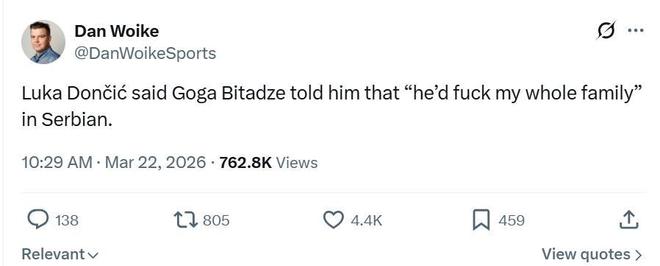 賽後采訪中東契奇再次確認這一說法:“他用塞爾維亞語朝我說我C你全傢(he’d fuck my whole family),我真得忍受不瞭瞭。”