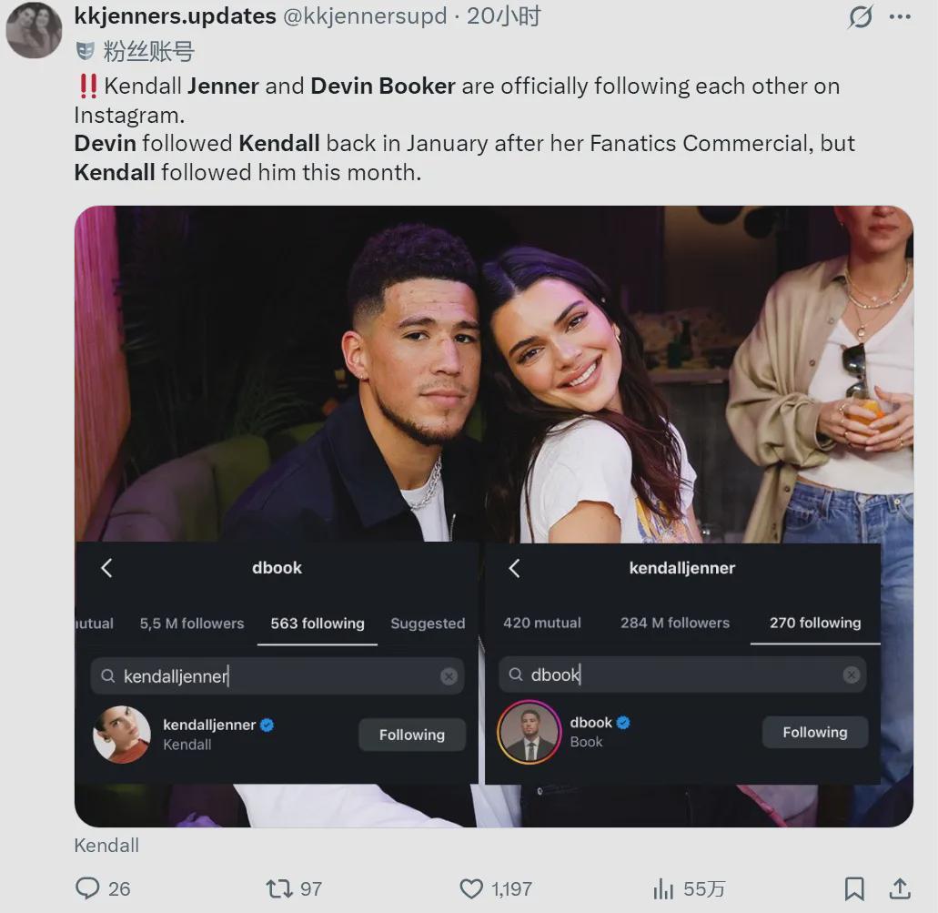 北京时间3月23日,据多家媒体爆料,肯达尔-詹娜在ins上回关布克,两个人正式恢复互关的状态。今年1月份布克率先关注詹娜,时隔两个月,詹娜也关注了布克。这个很好查证,教主在詹娜和布克的关注列表看一眼,确实已经互关。
