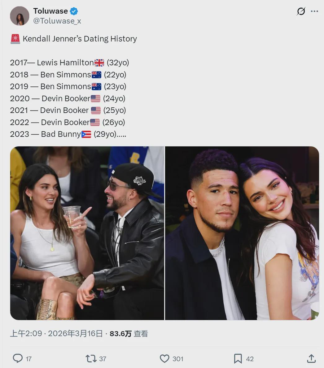不仅如此,今年1月30日,布克跟詹娜曾在评论区暧昧互动。布克写道:“我压一百万,海鹰队(NFL)比你更早拿到戒指。”过了十几分钟,詹娜回复:“你的脚踝怎么样了?(白眼的表情)”布克表示:“你来给我揉揉它……”引来不少吃瓜群众。