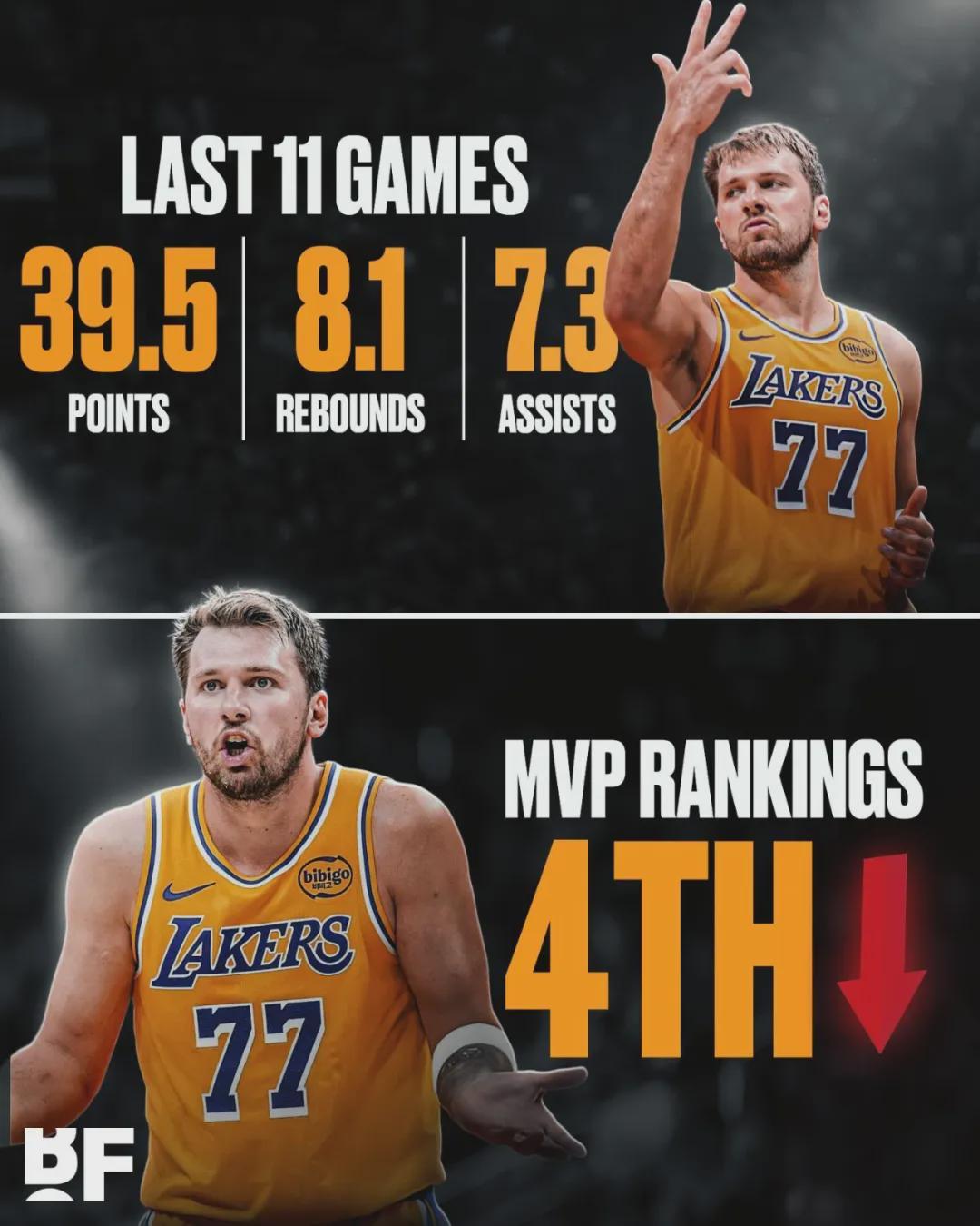 北京时间3月28日,NBA常规赛:湖人主场116-99战胜篮网。东契奇投篮25中15,三分10中5,罚球6中6,狂砍41分8板3助3断1帽。最近12场比赛,湖人11胜1负。但是,今天NBA官网公布MVP排行榜,东契奇从第二跌至第四。