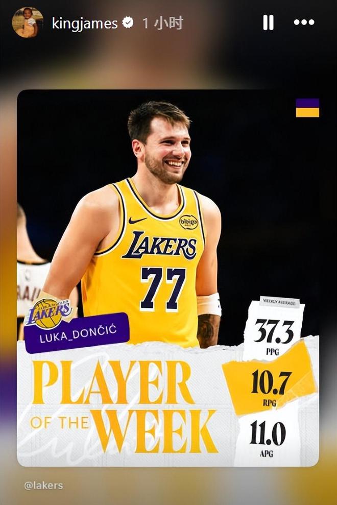 就在早些時候,東契奇當選西部周最佳球員,幫助湖人先後擊敗森林狼、公牛和掘金。他場均出戰38.3分鐘,得到37.3分,投籃命中率46.9%,三分命中率42.5%,罰球命中率79.2%,同時貢獻10.7個籃板、11.0次助攻、2.0次搶斷和1.7次蓋帽。這位27歲的球星在這三場比賽中砍下兩次三雙、一次兩雙,並貢獻瞭他加盟湖人後的首個50+得分表演。詹姆斯也第一時間為隊友送上祝賀。