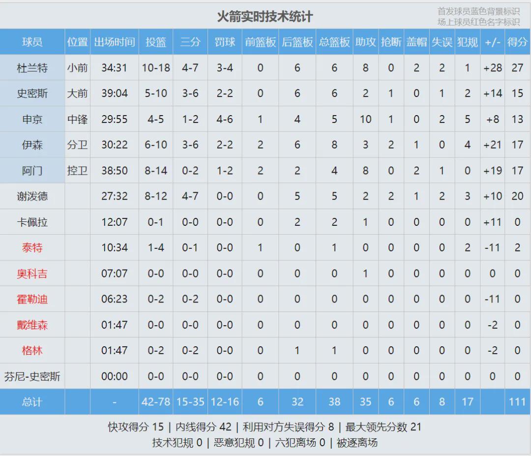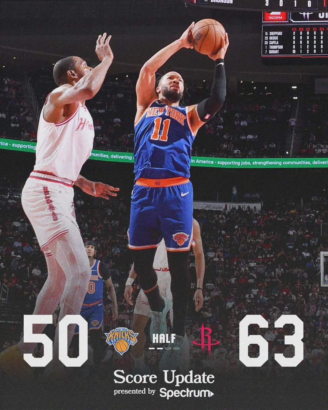 半场战罢,火箭63-50领先尼克斯13分。杜兰特10中7,半场砍下18分5篮板4助攻。伊森7中5拿到15分3篮板2助攻,正负值+23两队最高。第三节尼克斯进攻依然没有起色,单节仅得到22分,麦克布莱德前三节9中1,阿奴诺比8中2。
