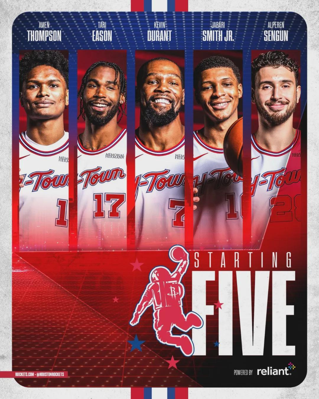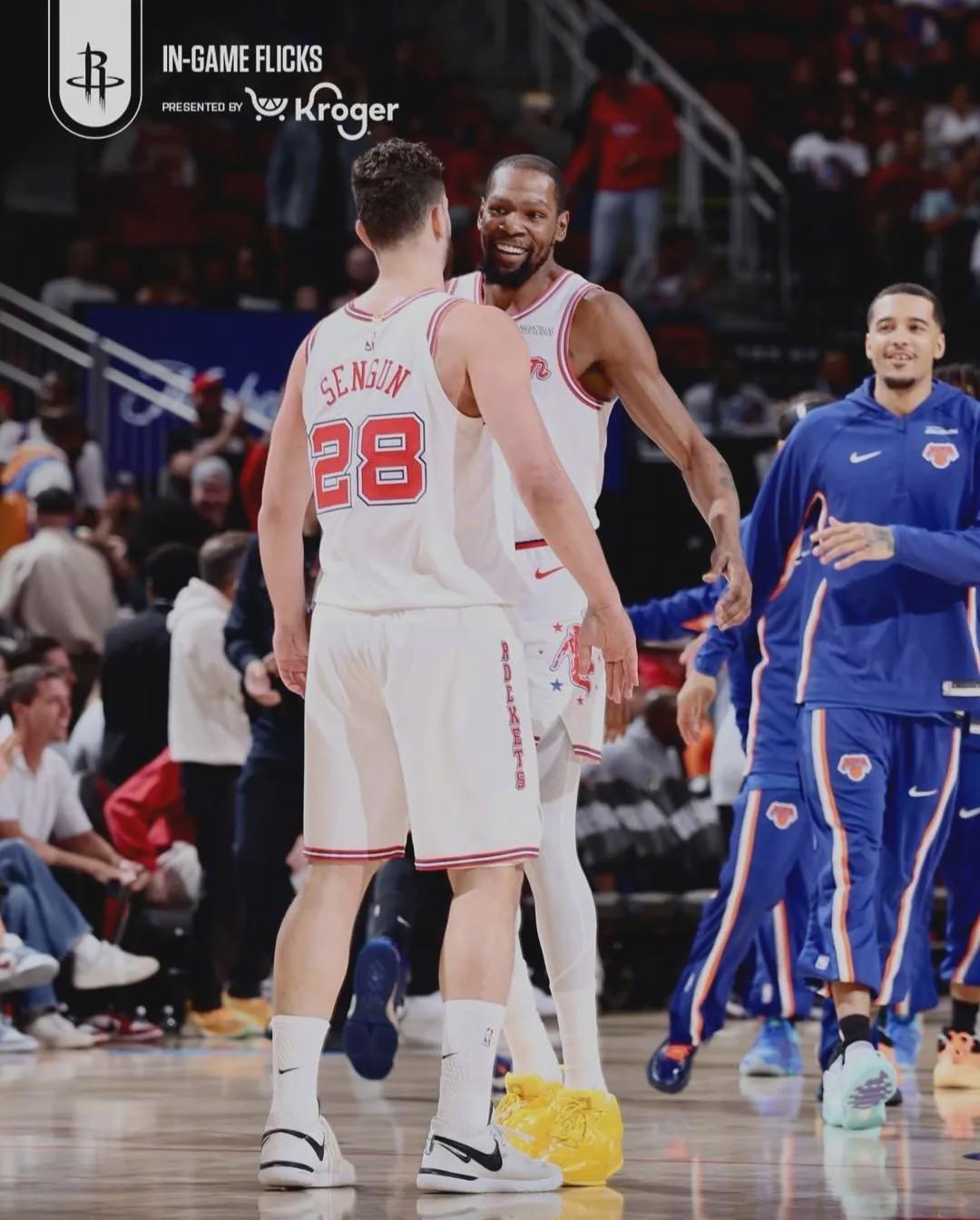 杜兰特开局连拿10分,火箭轰出14-1打停尼克斯。接下来换成伊森的表演时间,他单节4中4砍下10分,并且把布伦森防到6中2仅得5分2失误。火箭可能打出了本赛季最出色的第一节比赛,全队投篮命中率75%,三分命中率66.7%。