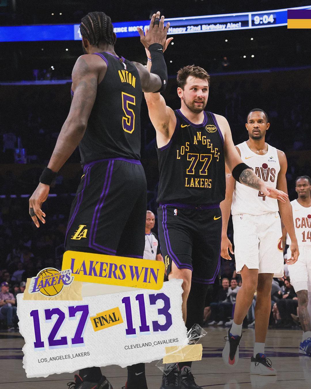 第四节骑士换上纯替补阵容,本来要放弃比赛了。湖人自己进攻断电,最后5分钟被骑士追到14分,湖人赶紧把东契奇换上场。东契奇连拿7分+1助攻,湖人再次拉开到20分。全场结束,湖人主场127-113战胜骑士,最近14场,湖人13胜1负。
