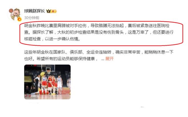 來到醫院之後,胡金秋馬上被安排進行檢查,根據最新消息瞭解,從檢查結果來看,還是一個比較理想的結果,胡金秋此番受傷沒有傷到骨頭,可以說,這也是不幸中的萬幸瞭。不過,具體的情況,還要進行一次核磁檢查,從而進一步確認胡金秋的傷情。