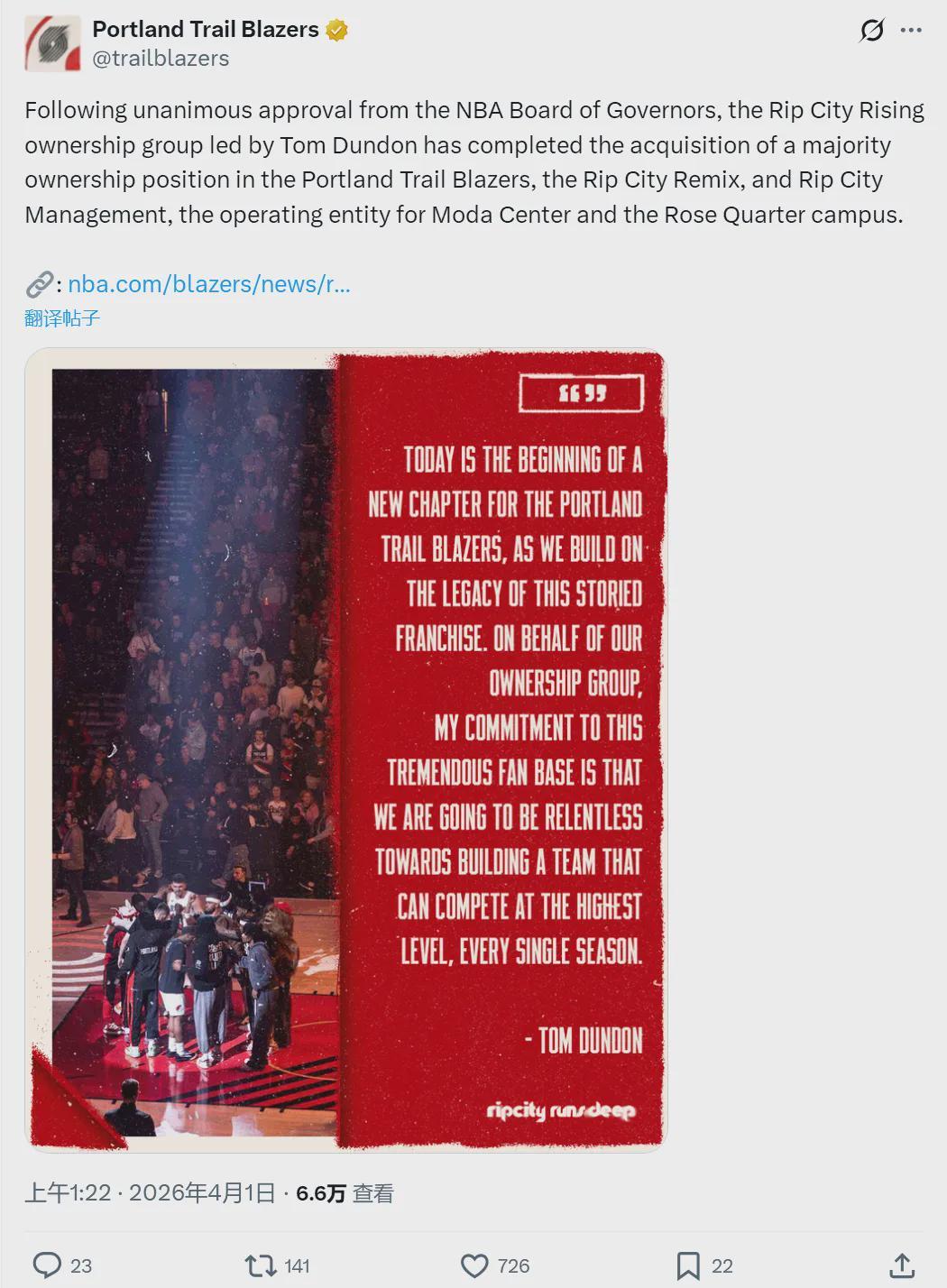 这件事并非NBA调查出来的,而是开拓者主动上报,所以联盟处罚并不重。很多球迷不理解:开拓者是不是傻?为啥要找着被罚?这事还得结合另外一条新闻:4月1日开拓者官宣,联盟董事会已经批准,汤姆-邓顿领衔的投资集团完成对开拓者的收购。