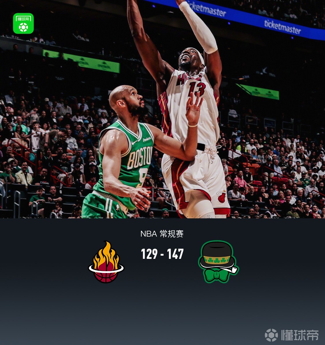 北京时间4月2日NBA 常规赛,迈阿密热火对阵波士顿凯尔特人。半场热火57-80凯尔特人,最终热火129-147凯尔特人。