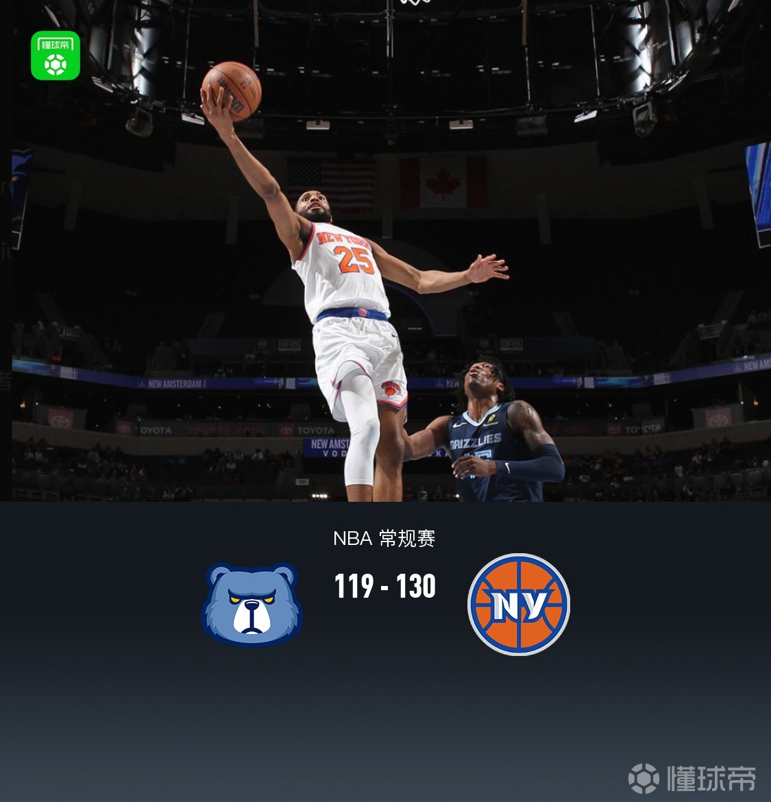 第四节灰熊GG-杰克逊拿下20分,尼克斯OG-阿奴诺比拿下25分,最终灰熊119-130不敌尼克斯