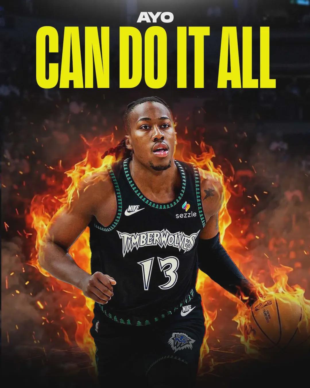 截至今天赛前,森林狼46胜29负排名西部第五。最近4场比赛,森林狼新援阿约-多森姆(Ayo Dosunmu)场均砍下18.8分10.5篮板8助攻1.8抢断0.5盖帽1.5失误。投篮命中率51.9%,三分命中率52.9%,罚球命中率90.9%。