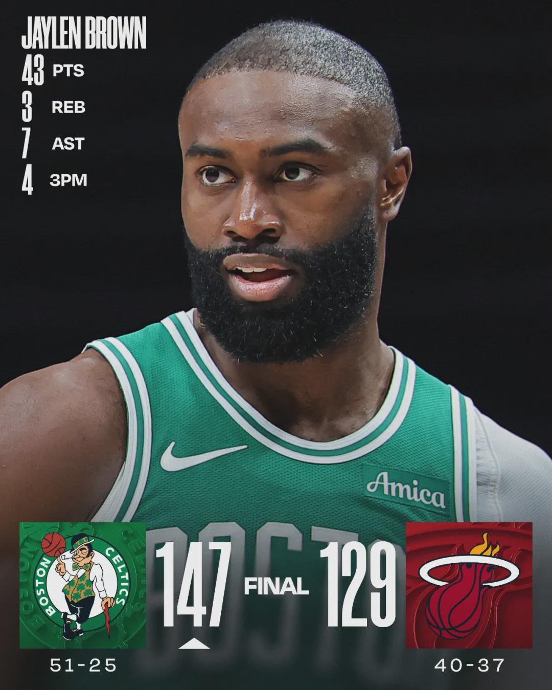 阿德巴约21投10中,三分10中5,罚球8中4,拿到29分10板2助2断,正负值-23并列全场最低。绿军双探花爆发:杰伦-布朗29投17中,三分10中4,罚球7中5,砍下43分4板7助。他本赛季7次砍下40+,此前9个赛季一共10次。