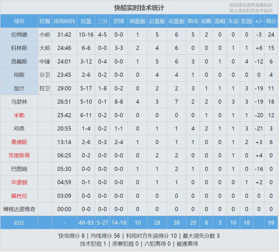 此役伦纳德投篮16中10,三分5中4,0罚球,拿到24分6篮板5助攻2抢断,正负值-3。除了伦纳德之外,其余快船球员三分21中1。这是两队本赛季最后一次交手,马刺成功三杀快船。前两次交手马刺各赢4分,今天大胜快船19分。
