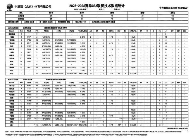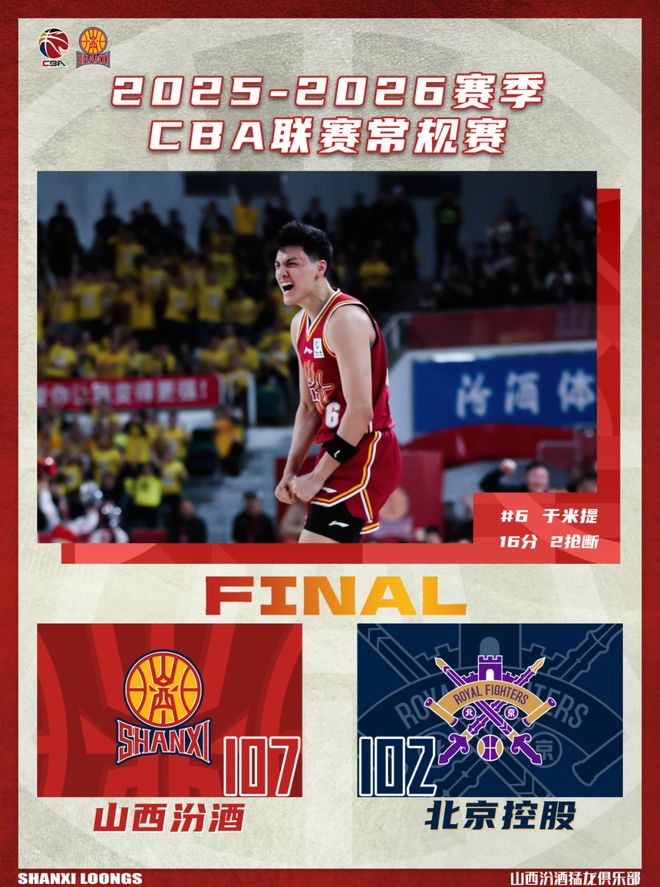 北京時間2026年3月17日19:35,2025-2026賽季常規賽第27輪繼續進行,山西汾酒主場迎戰北京控股。兩隊歷史上共交手23次,山西汾酒13勝10負,上賽季兩隊交手2次,山西汾酒1勝1負。本場比賽,山西隊上半場發揮出色,全隊用積極的態度建立起大比分領先優勢,下半場有所松懈,防守註意力不夠集中,對籃板球的保護做得也不夠好,給瞭對手太多追分機會,需繼續總結。最終全場比賽結束,山西汾酒107:102戰勝北京控股。