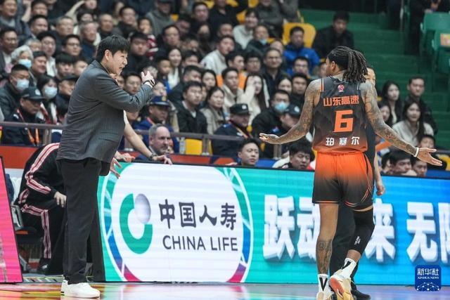 3月16日,山東高速隊主教練邱彪(左)在比賽中和隊員珀塞爾交流。新華社記者 朱崢 攝