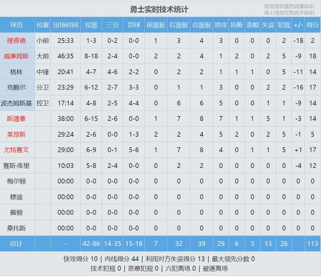 追梦上半场身背4次犯规,第三节打了4分多钟,吃到个人第5犯。不过追梦在进攻端手感不错,第三节投进3记三分。马刺防守有些松懈,勇士第三节34-26单节追回8分。三节打完马刺96-83领先13分,文班前三节已经砍下34+14+3!
