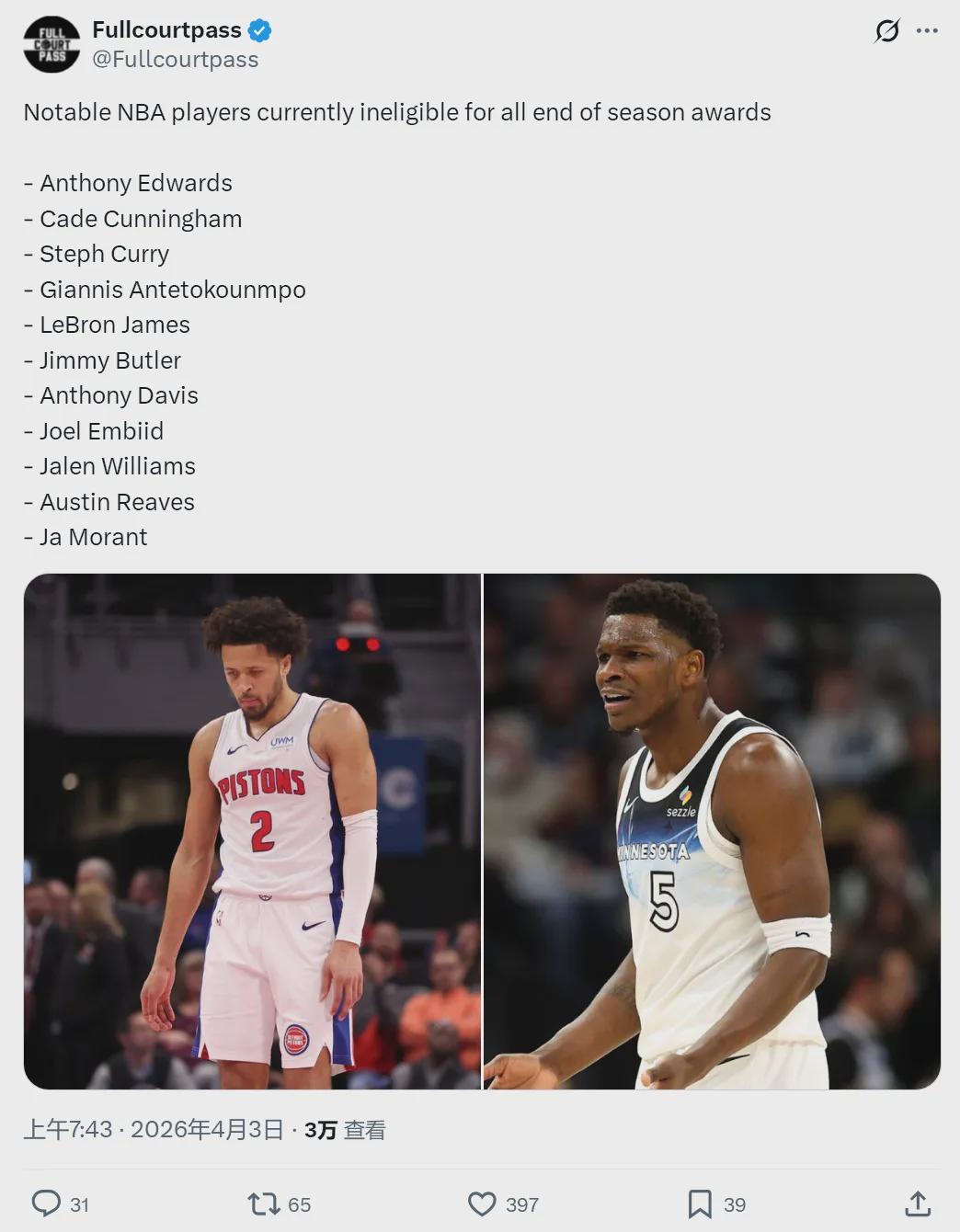 截至目前,爱德华兹打了59场常规赛。不算今天这场比赛,森林狼还有6场比赛要打。如果华子剩余6场保持全勤,不是刚好65场吗?本赛季第三场比赛(10月27日),爱德华兹只打了3分钟伤退,出战不足15分钟,因此并不算数。