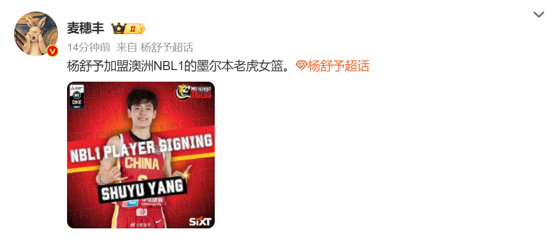 今天早上,中国篮球圈传来了重磅消息:中国女篮现任队长、广东女篮核心球员杨舒予选择出国打球,她将加盟澳洲NBL1级联赛的墨尔本老虎女篮。