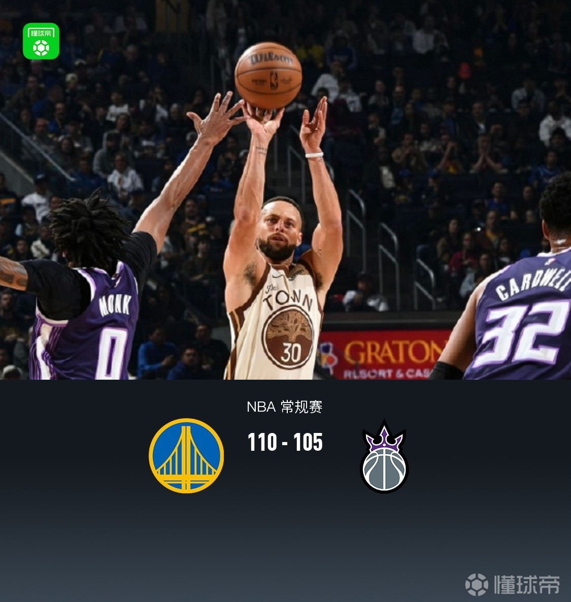 第四节,开节国王延续势头阿丘瓦、考德威尔、迈克德莫特相继得分反超比分,勇士梅尔顿连续三分止血,随后双方继续拉锯交替领先,比赛还剩2分多钟国王迈克德莫特三分领先3分,勇士库里立刻三分回应,紧跟波杰姆斯基再中三分反超,国王进攻继续不中,勇士赛斯库里罚球再得2分领先5分,最后阶段国王继续进攻未果,全场结束,勇士110-105国王。