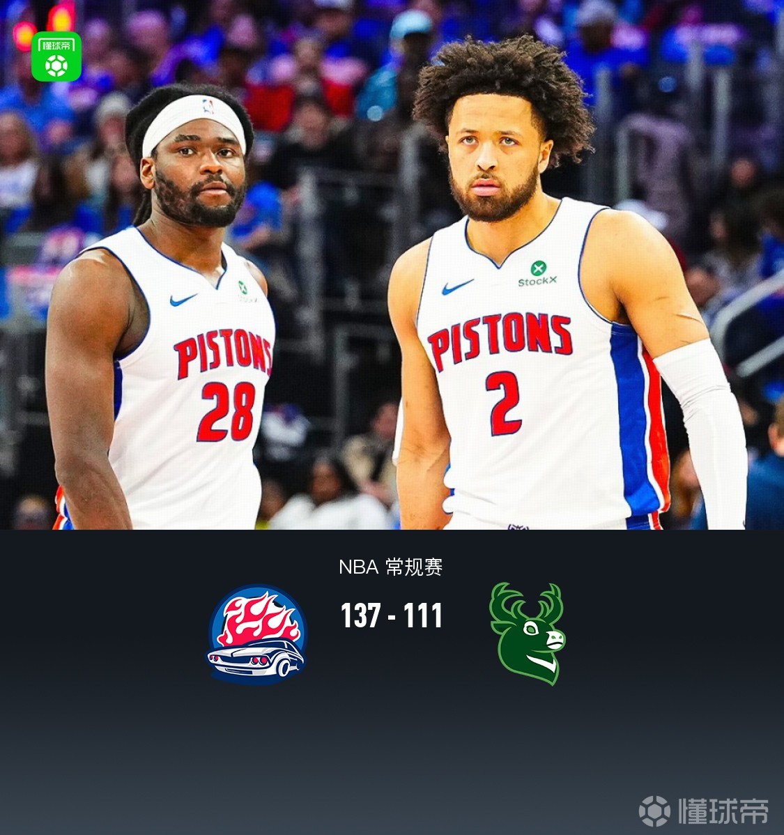 第四节活塞杰伦-杜伦拿下10分,雄鹿科马克-瑞安拿下8分,最终活塞137-111战胜雄鹿