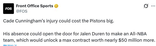 運動醫學專傢斯托茨表示:氣胸球員平均缺戰26天,大約缺席10.8場比賽。一旦缺戰太久,坎寧安將無法滿足出勤要求。美媒指出,坎寧安若無緣最佳陣容,可能會利好隊友杜倫。