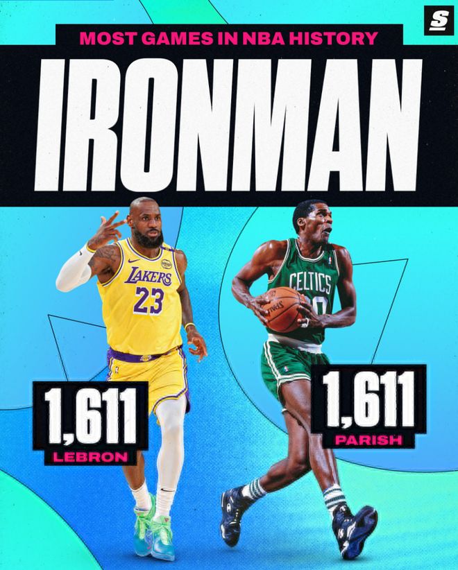 昨夜勒佈朗在面對火箭的比賽中14中13+三分2中2拿到30分一戰刷新多項紀錄,41歲的老將此役決定出戰背靠背後他生涯登場數1611場追平瞭帕特裡什並列歷史第一,這位歷史最長的河繼續創造歷史。