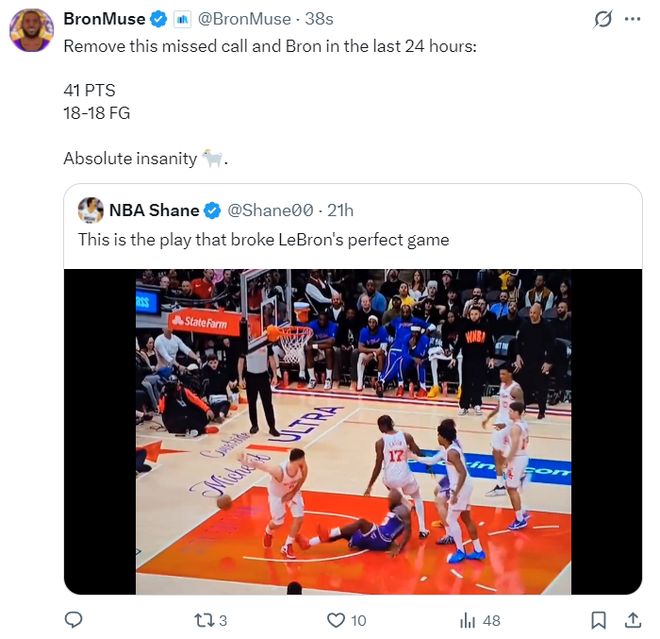 湖人媒體:如果不算申京那個犯規沒有吹罰的未進球,詹姆斯在短短24小時內是一波18中18,這實在是太瘋狂瞭,GOAT。