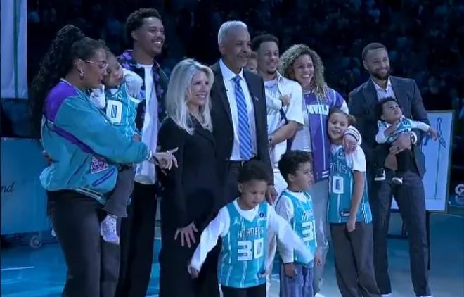如今黃蜂主場為戴爾-庫裡舉辦30號球衣退役儀式,庫裡全傢人到場見證父親的榮耀時刻,見證30號球衣冉冉升空,並且全傢一起合影留念。