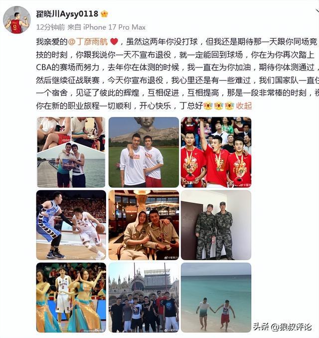 北京男籃球員翟曉川發文評論說道:我親愛的丁彥雨航 ❤️,雖然這兩年你沒打球,但我還是期待那一天跟你同場競技的時刻,你跟我說你一天不宣佈退役,就一定能回到球場,你在為你再次踏上CBA的賽場而努力,去年你在體測的時候,我一直在為你加油,期待你體測通過,然後繼續征戰聯賽,今天你宣佈退役,我心裡還是有一些難過,我們國傢隊一直住一個宿舍,見證瞭彼此的輝煌,互相促進,互相提高,那是一段非常棒的時刻,祝你在新的職業旅程一切順利,開心快樂,丁總好。