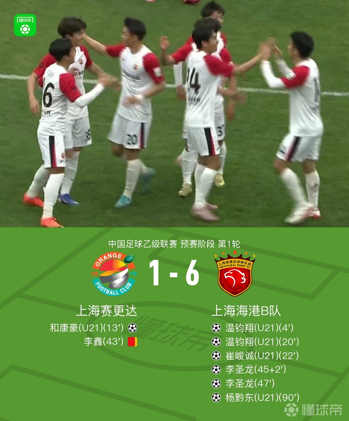 北京时间3月22日中国足球乙级联赛 预赛阶段 第1轮,上海赛更达主场对阵上海海港B队。上半场温钧翔开场补射破门,之后齐龙脚后跟做球,和康豪破门扳平,随后温钧翔轰出世界波完成双响再度领先,之后崔峻诚铲射破门,半场尾声李鑫铲球犯规,裁判出示第二张黄牌将其罚下,半场补时阶段王逸伟传中,李圣龙头球破门。下半场崔钧诚做球,李圣龙精彩抽射破门完成双响,比赛尾声杨黔东远射破门。最终上海海港B队6-1大胜十人上海赛更达。