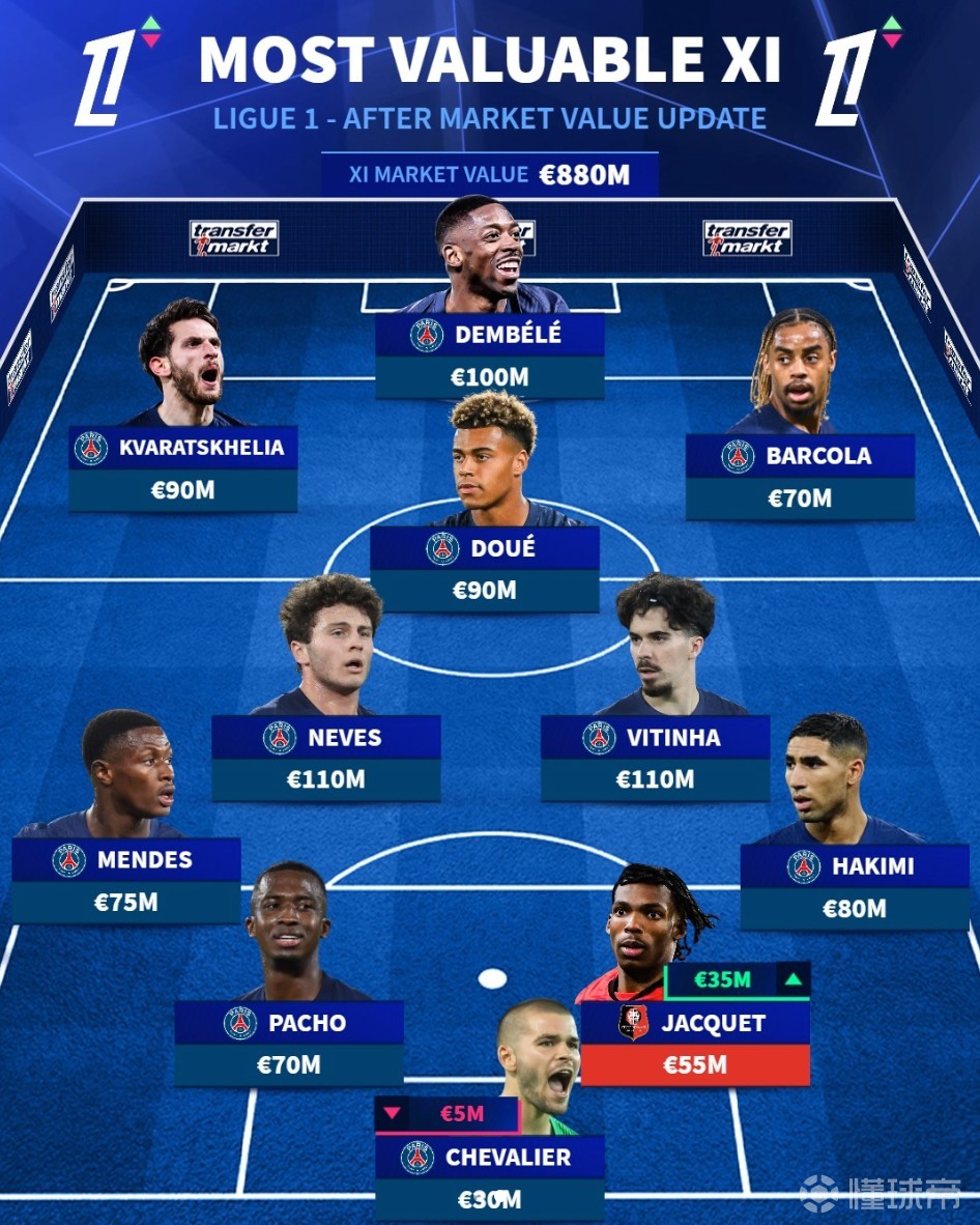 北京时间3月28日,在更新了法甲球员的身价之后,德转列出了法甲身价最高的11人阵容,巴黎圣日耳曼10人入选,若昂-内维斯和维蒂尼亚1.1亿欧元最高,此次更新身价暴涨3500万欧元的杰里米-雅凯是唯一上榜的非PSG球员。