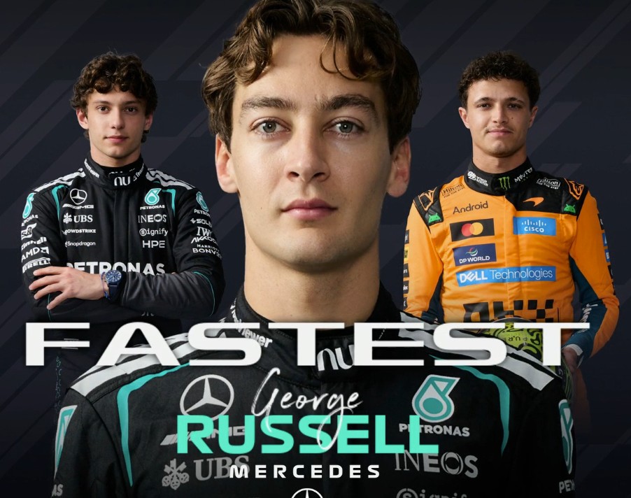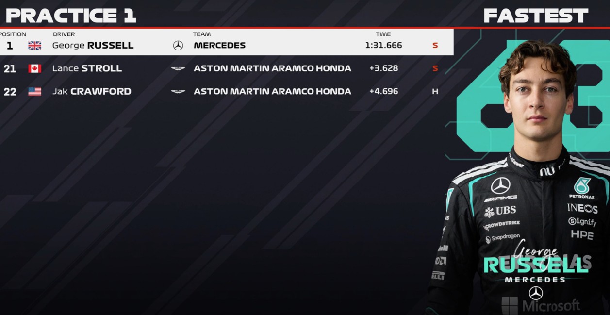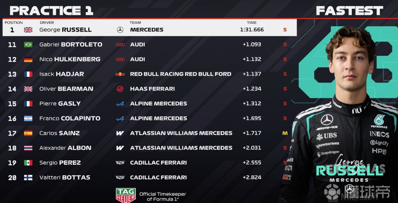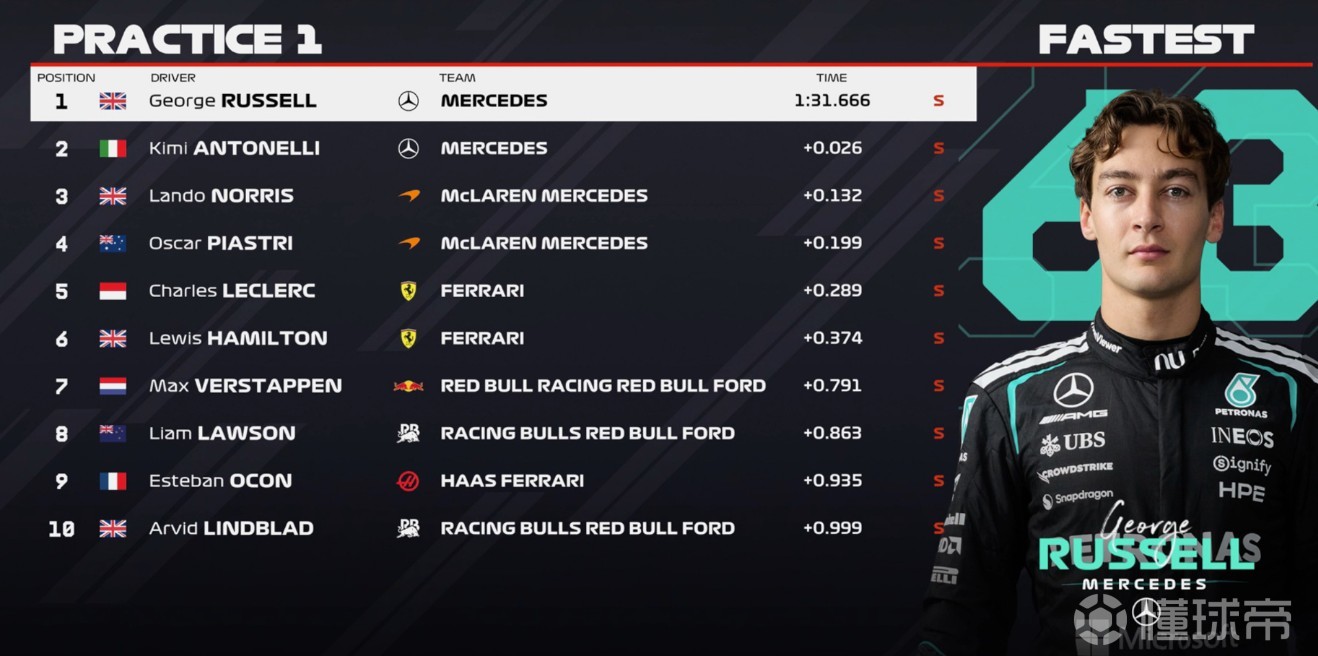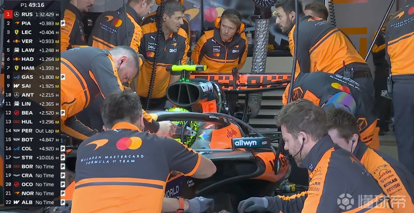 一练停表,拉塞尔全场最快,安东内利第二,迈凯伦三四,法拉利五六,维斯塔潘第七。