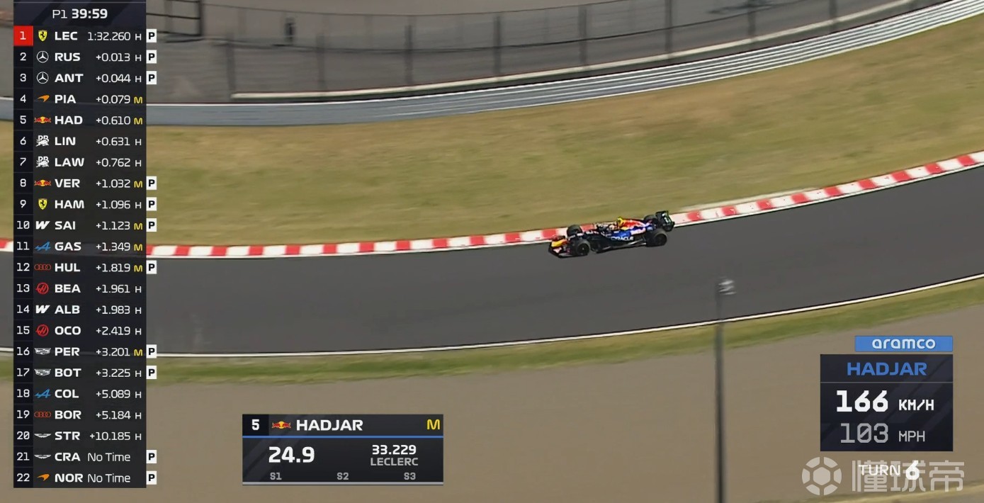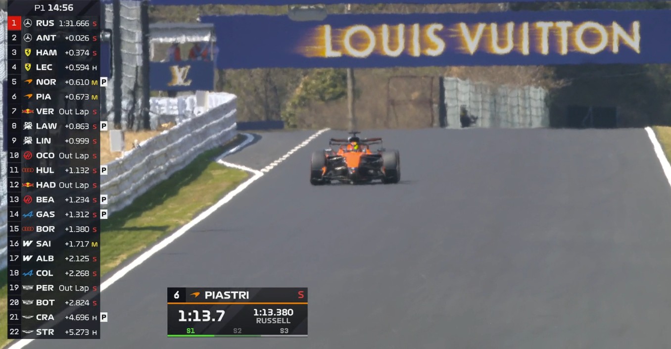 北京时间3月27日,F1日本站一练,拉塞尔全场最快,安东内利第二,迈凯伦三四,法拉利五六,维斯塔潘第七,劳森第八,奥康第九,林德布拉德第十。