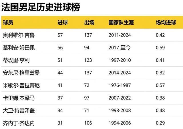 这是姆巴佩为国家队出战95场比赛打进的第56球。目前,法国队史的第一射手还是吉鲁(137场57球)。27岁的姆巴佩现在只要再进一球,就能和老大哥平起平坐。虽然他在第66分钟就被图拉姆换下,且上半场还踢偏了两记射门,但这种“高效”确实让后辈们压力山大。