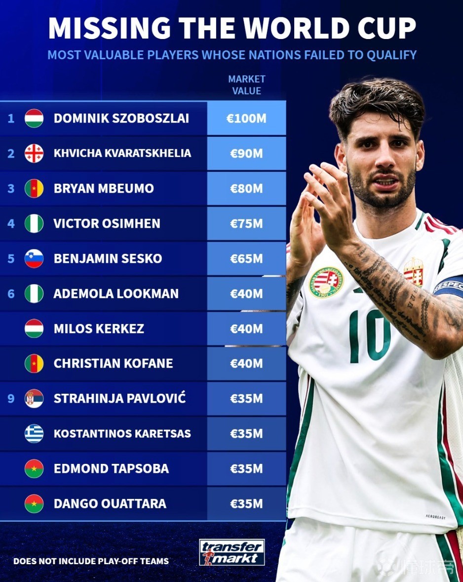北京时间3月27日,在世界杯附加赛首个比赛日结束后,德国转会市场发布了无缘世界杯球员身价榜。匈牙利球员索博斯洛伊以一亿欧的身价位列榜首。