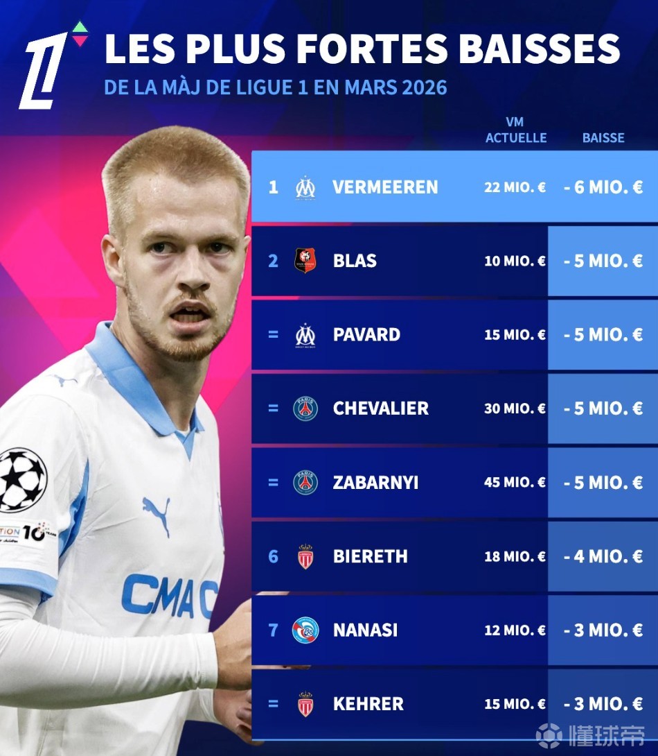 德转更新法甲球员身价跌幅榜TOP8: