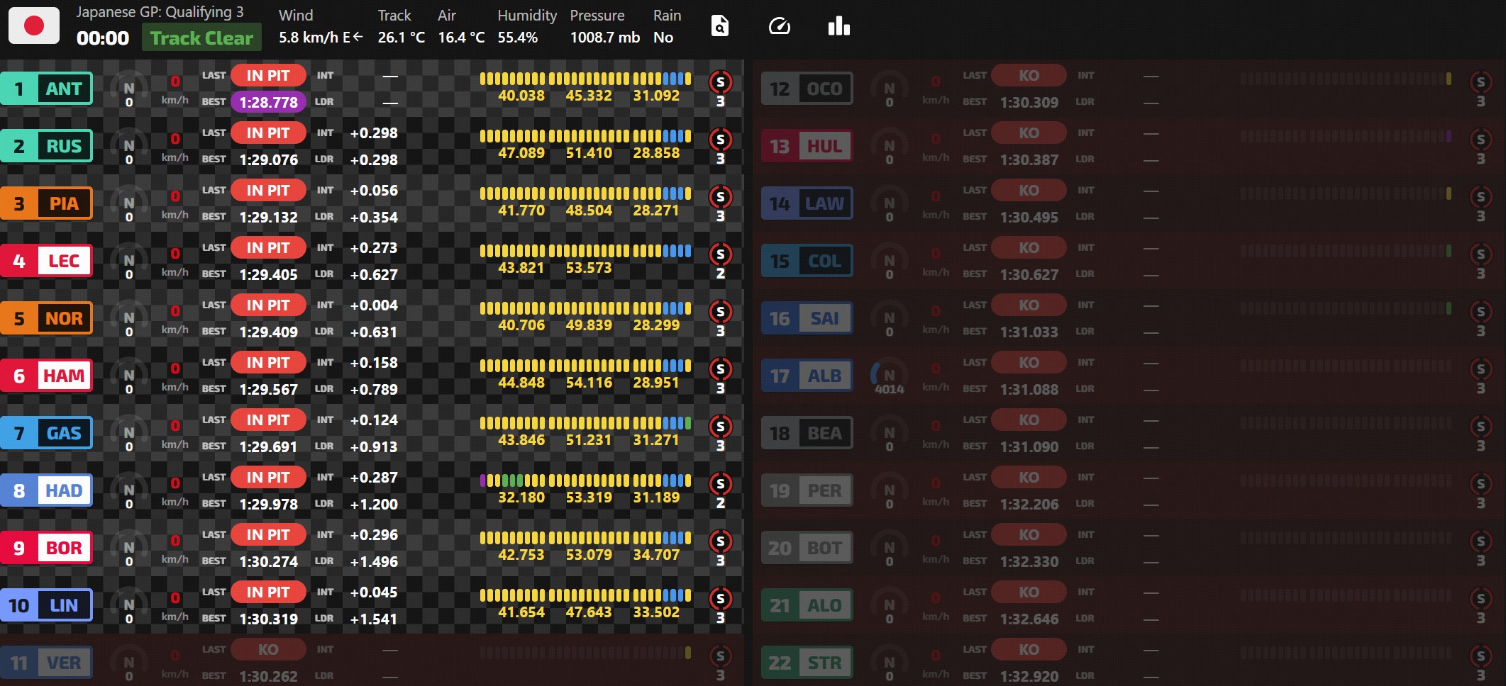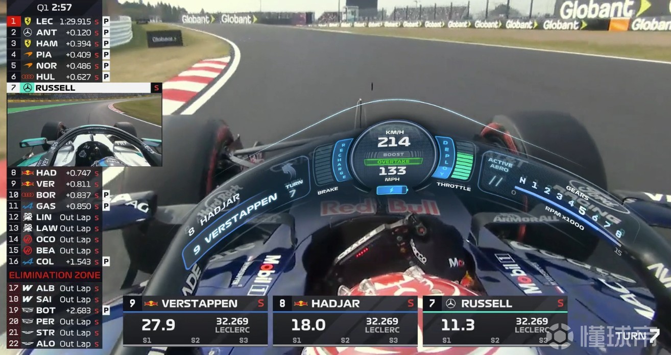 最终Q3结束,安东内利拿到杆位,拉塞尔第二,皮亚斯特里第三,勒克莱尔第四。