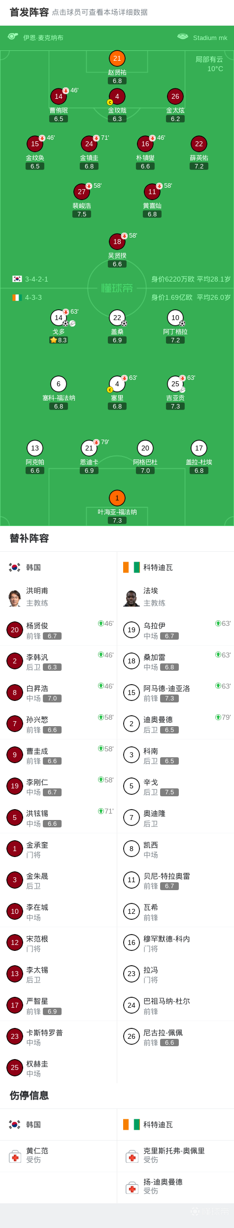 北京时间3月28日国际友谊赛,韩国对阵科特迪瓦。戈多传射、盖桑、阿丁格拉、辛戈破门。最终比分韩国 0-4 科特迪瓦。