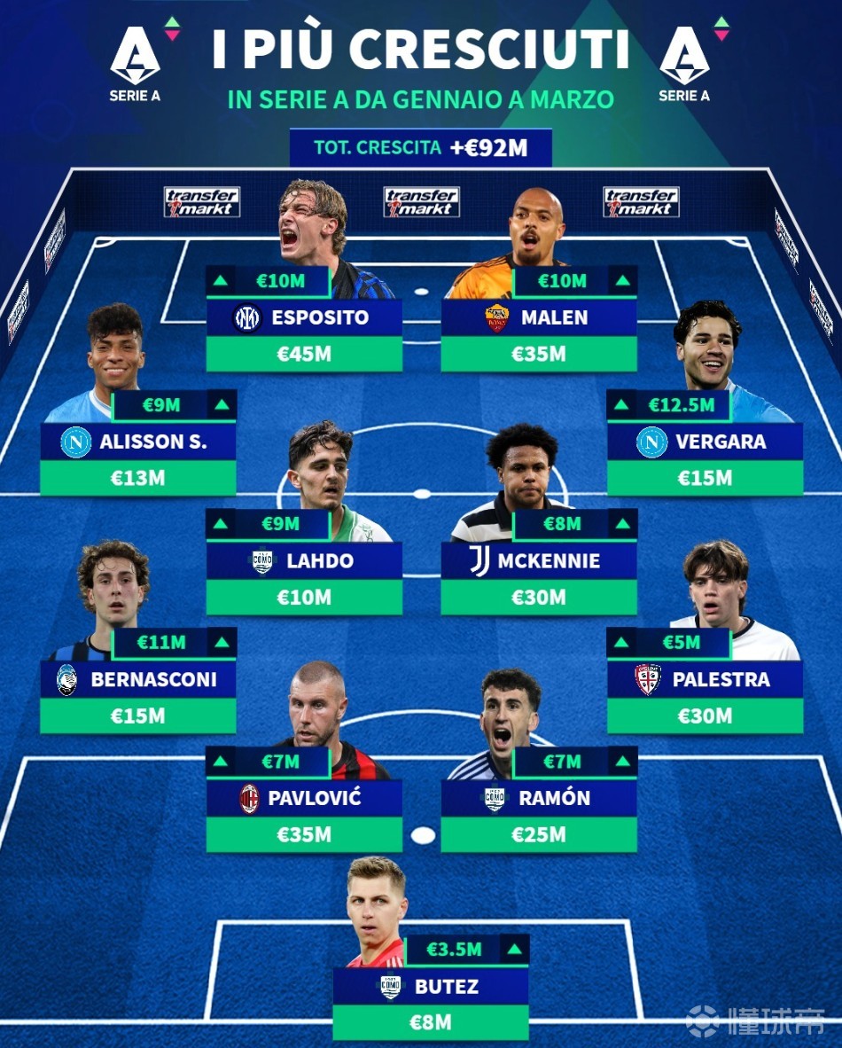 北京时间3月29日,在更新了意甲球员的身价之后,德转列出了此次更新身价上涨最佳11人阵容,皮奥-埃斯波西托领衔,马伦、麦肯尼、帕夫洛维奇在列。