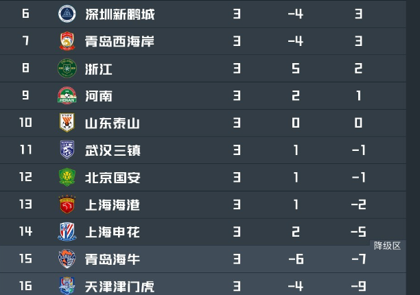 前面3轮中超战罢,上海申花1胜2平,未尝败绩,积5分,减去起步时所扣掉的-10,申花目前的积分仅为-5,还在负分阶段挣扎,排在中超积分榜的倒数第3位。而对手天津津门虎更惨,前面3轮过后,他们1平2负,积1分,减去起步时所扣掉的-10,津门虎目前的积分仅为-9,妥妥积分垫底,沦为中超副班长。