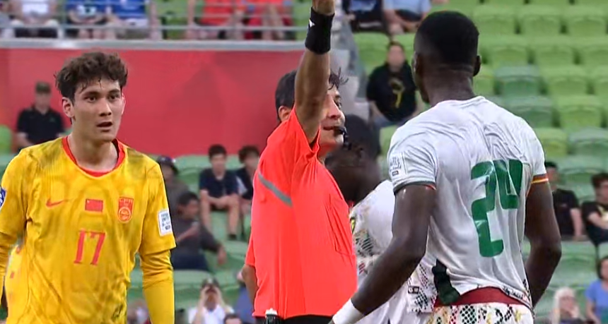 起身之后,拜合拉木非常愤怒,怒目圆睁瞪着对手,主裁判随即向凯勒出示第二张黄牌,凯勒被红牌罚下。