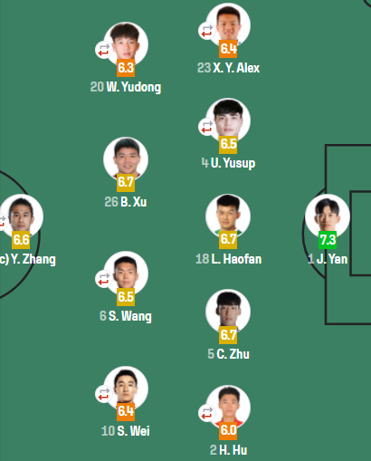面对喀麦隆,邵佳一对首发阵容做出2个调整,吾米提江、胡荷韬首发出场。在首发出场的球员里,胡荷韬仅得到6.0分,在所有球员里垫底。