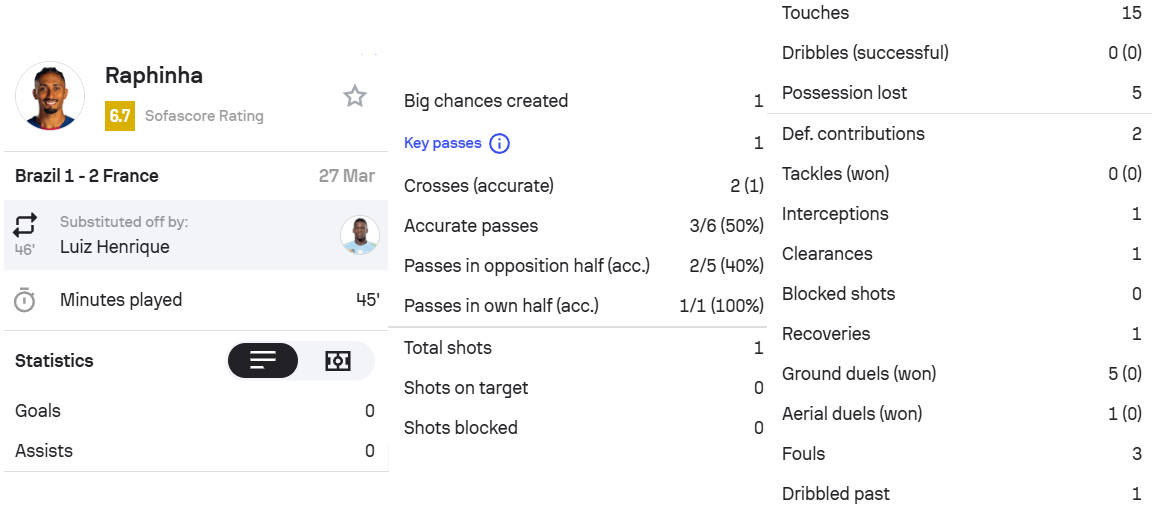 拉菲尼亚本场比赛首发出场45分钟,获评6.7分。