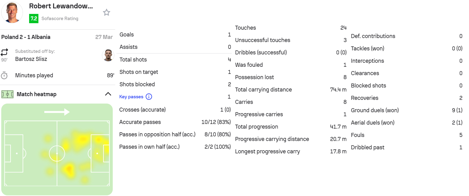 1.莱万,波兰2-1阿尔巴尼亚,首发出场89分钟,进1球,黄牌1张。