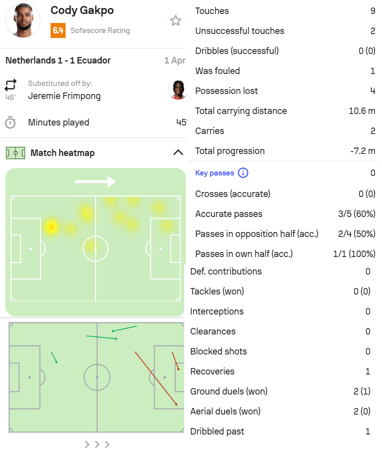 2.加克波,荷兰1-1厄瓜多尔,首发出场45分钟。