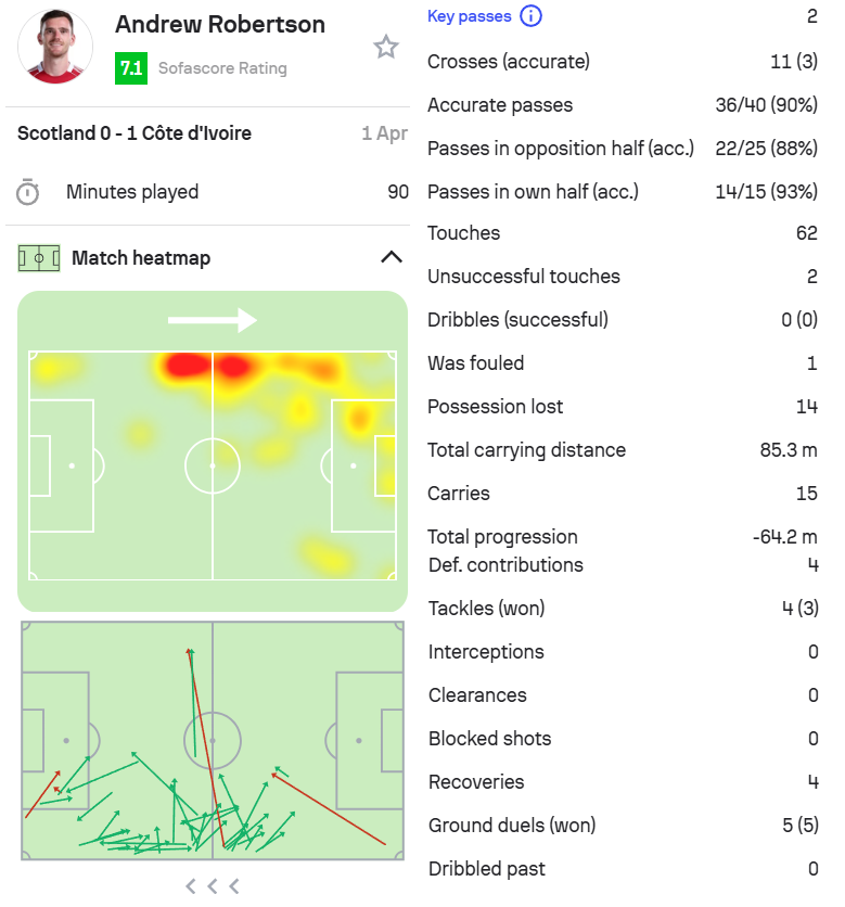 9.罗伯逊,苏格兰0-1科特迪瓦,首发打满全场。