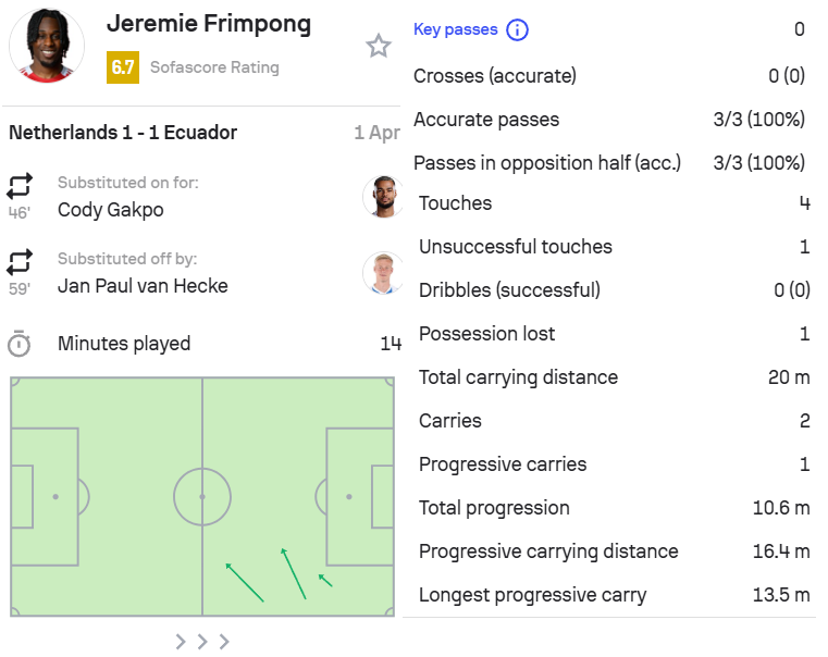 4.弗林蓬,荷兰1-1厄瓜多尔,第46分钟替补出场,第59分钟被换下场。