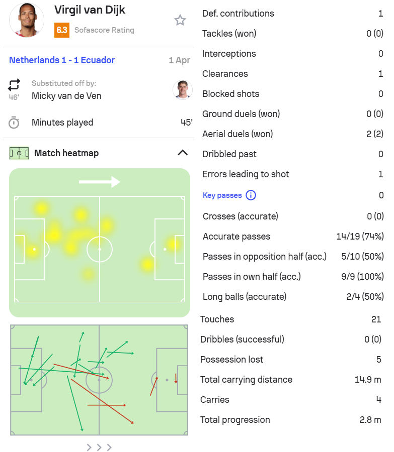 1.范戴克,荷兰1-1厄瓜多尔,首发出场45分钟。