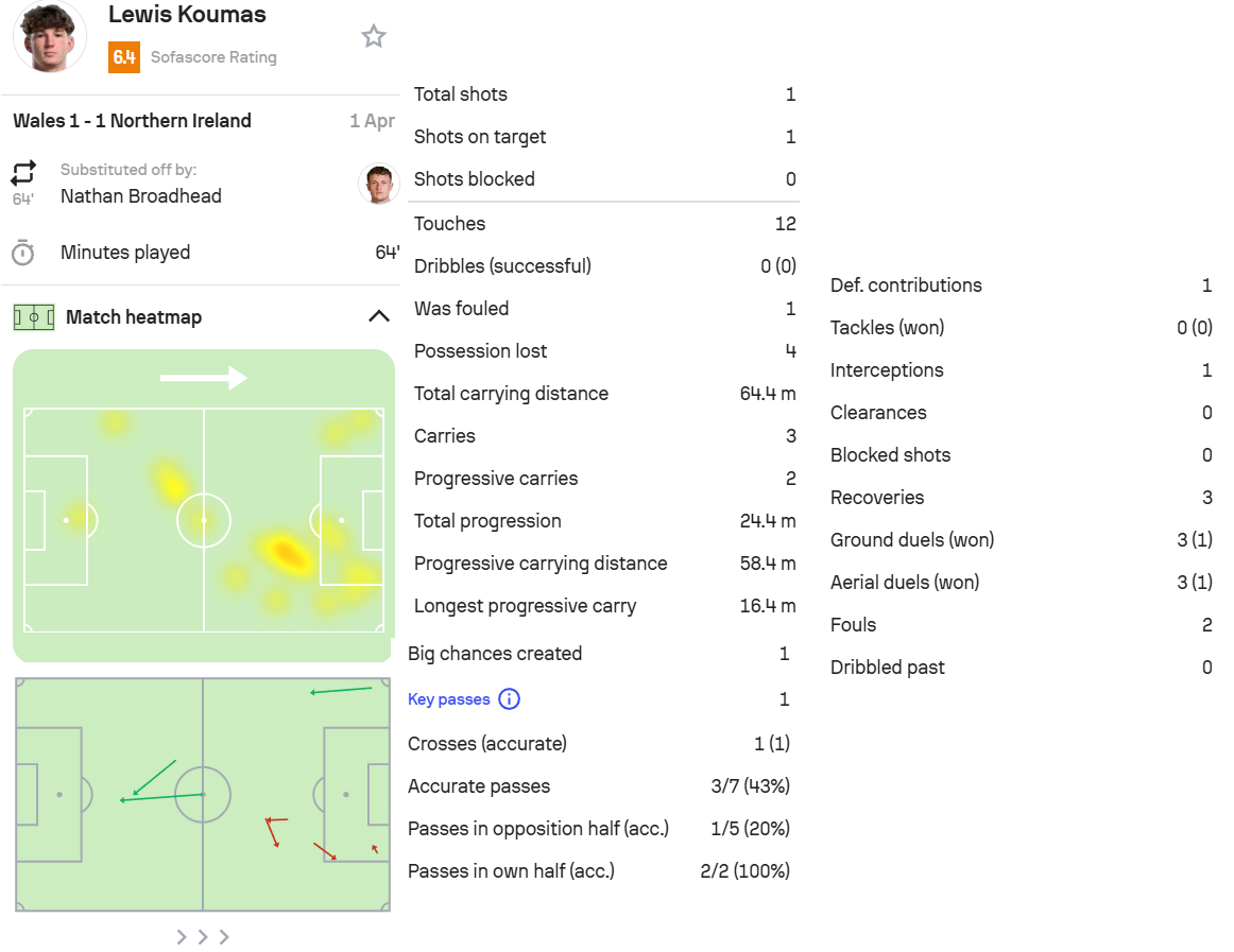 13.库马斯(外租),威尔士1-1北爱尔兰,首发出场64分钟。